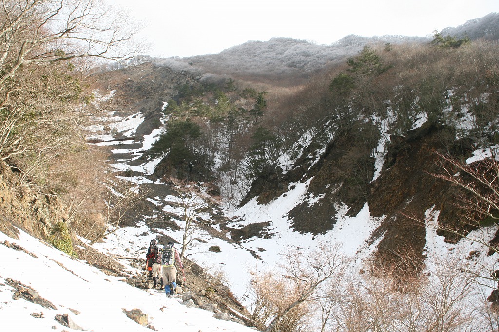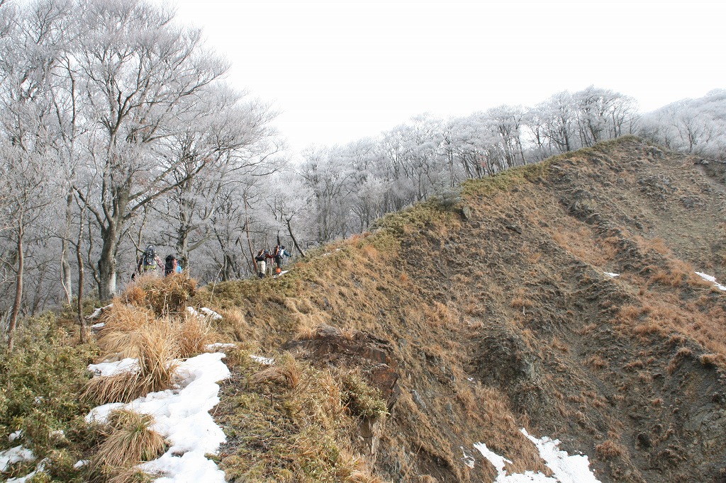 の稜線が恐かったでしょうね。雪があまりなく凍結していたからです。ただ、右端の凍結していない部分を歩けば、アイゼンなしで