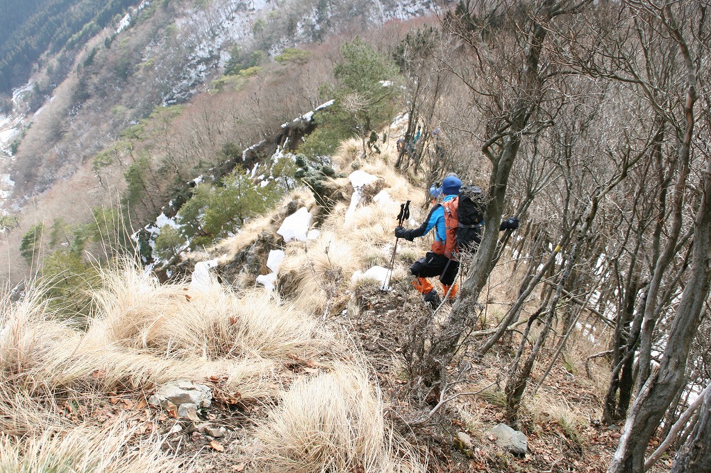 まずは綿向山北峰から急斜面を滑るように下り、しばらくは雪のついた斜面を歩くと、笹原の1本道に入る。ここが最も雪が少なかったが、何