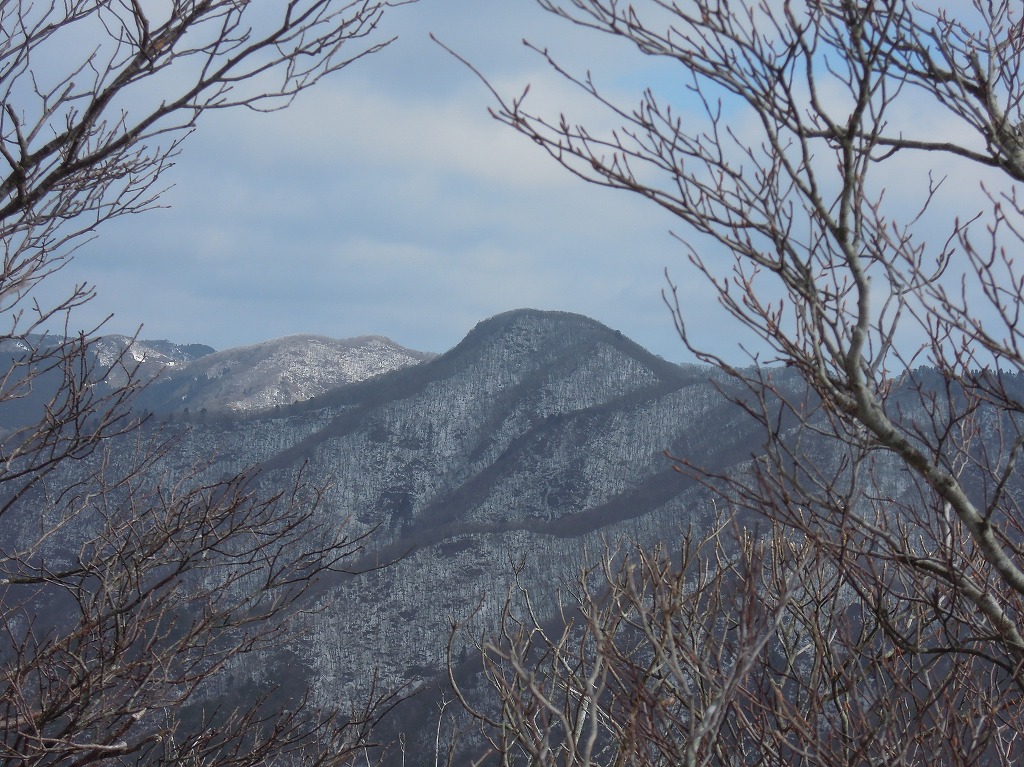 ら文三ハゲを見下ろすと斑状態の雪があり、その向こうには水無山(南峰・北峰)がどっかりと座っている。稜線の道は雪が少なく凍結してい