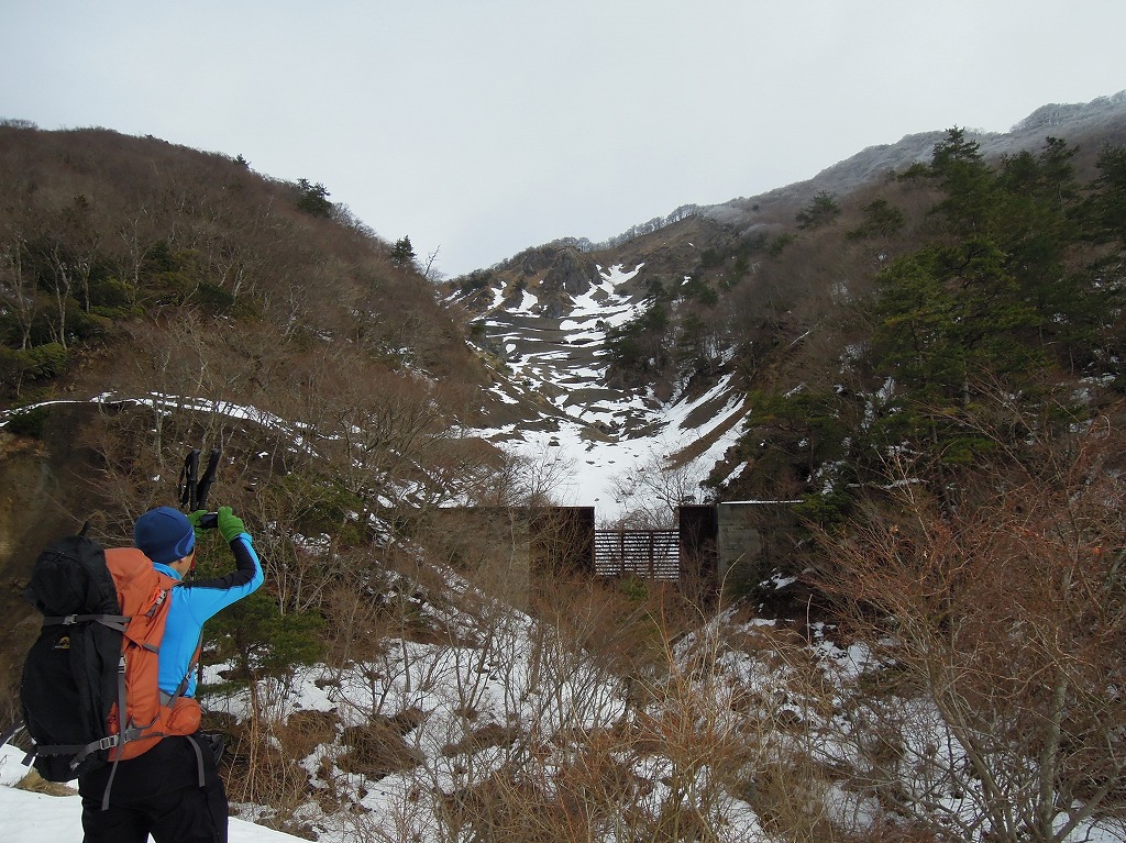 ガレ場の中央にあるひな壇のような鉄柵の左側をほぼ直登していく。雪は少ないが、雨で固まった状態でキックステップを効かせるとサクサク