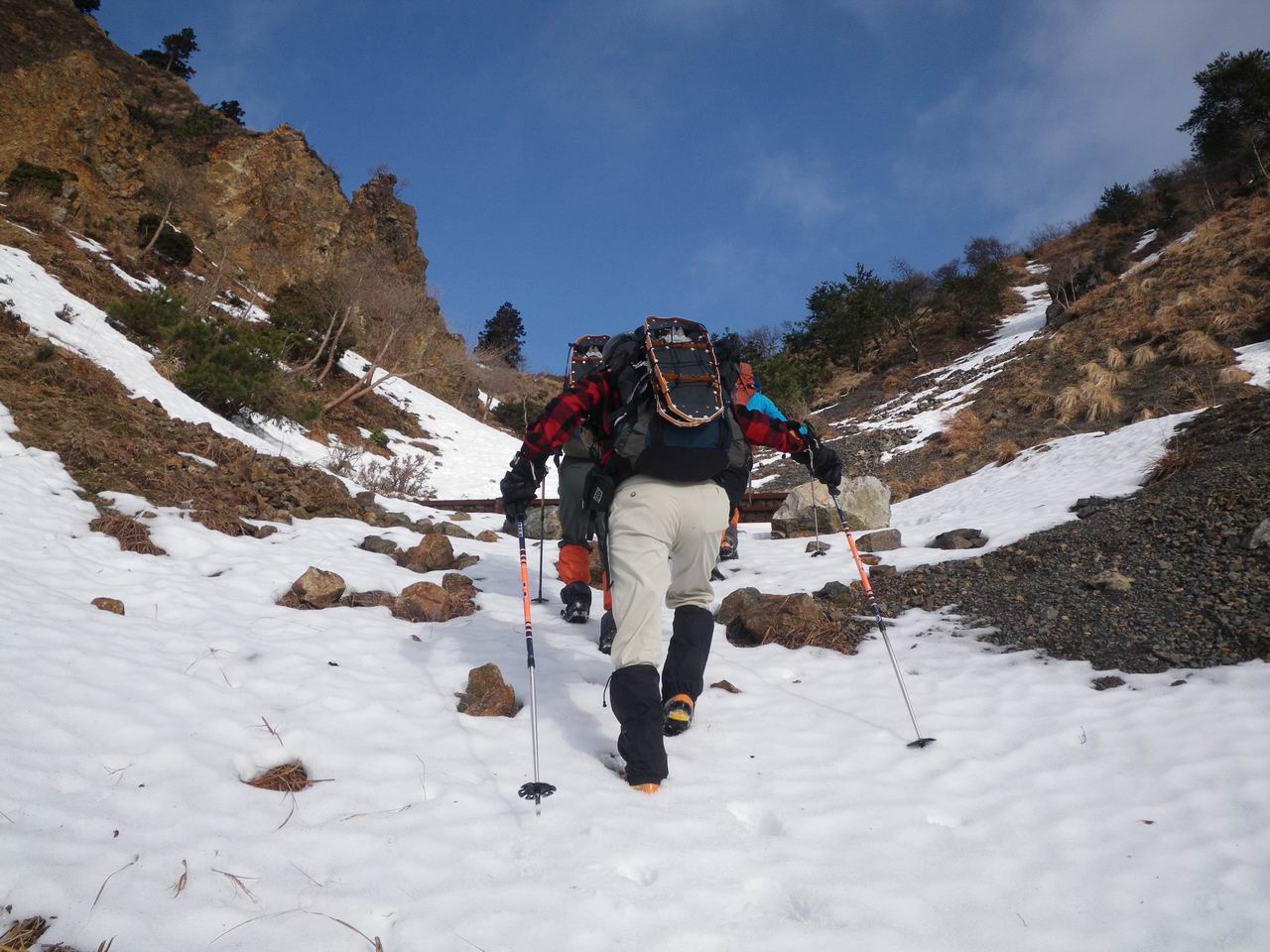 > に登り易かったですね。文三ハゲ上端のヤセ尾根上りでは残雪や地肌が凍てついていたので、怖くなってここでアイゼンをつけ