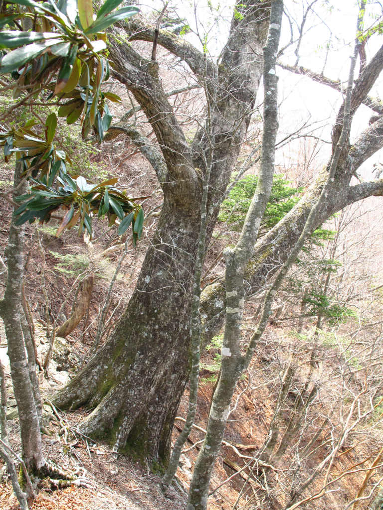 さて、来た道を戻る。出迎えてくれた大ミズナラを過ぎ尾根道を下る。この道は良くできている。1箇所ナイフリッジになった所があるが、ロープがあり難なく通過できる。それ以外は、両側が切り立った状態でも道自体はしっかりと安定している。私のエアリアには廃道と書かれており2万五千の地図には尾根道が宮ノ谷に向かっている。そして、コルや支尾根が取り付く地点などには杣道の目印となるミズナラやモミノキの大木が何本も残されている。よく考えて見るとこの尾根は木地師集落の蓮や江馬小屋に向かって伸びている。木地師が山に入り木を調達するのにこの尾根を使わないはずはない。2万五千の地図に書かれている道は、木地師が使った杣道なのだろう。これだけのミズナラやモミノキの大木が残されている事からもわかる。