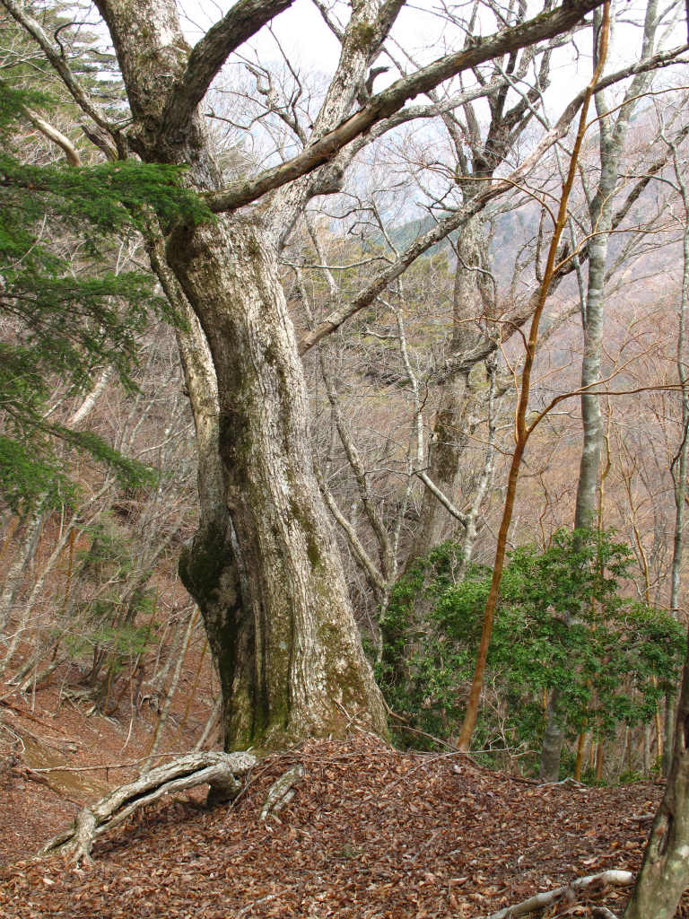 そして、コルや支尾根が取り付く地点などには杣道の目印となるミズナラやモミノキの大木が何本も残されている。よく考えて見るとこの尾根は木地師集落の蓮や江馬小屋に向かって伸びている。木地師が山に入り木を調達するのにこの尾根を使わないはずはない。2万五千の地図に書かれている道は、木地師が使った杣道なのだろう。これだけのミズナラやモミノキの大木が残されている事からもわかる。