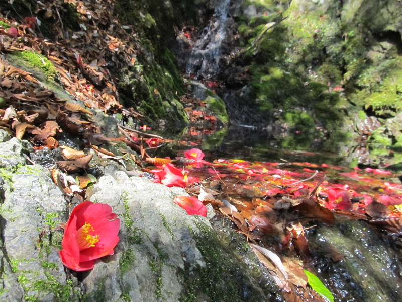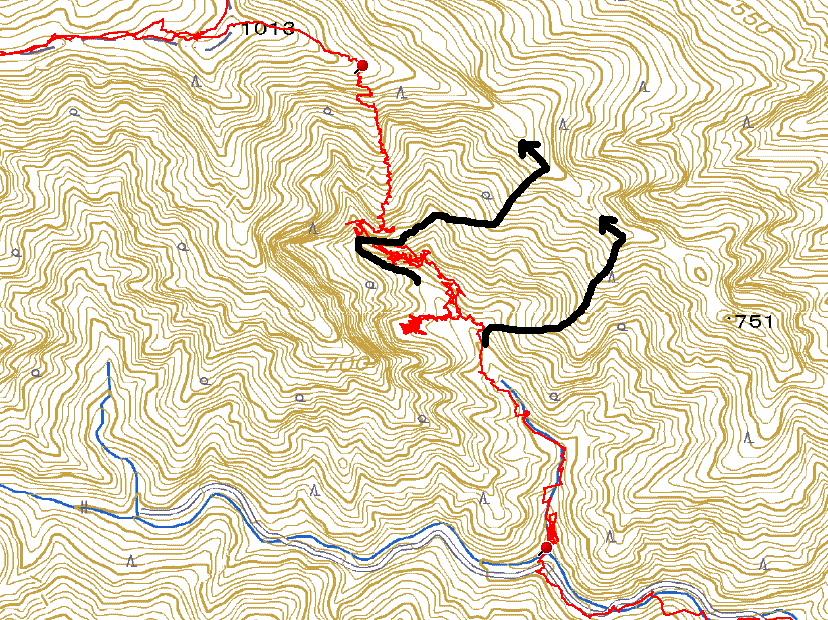 しばらく行くと2段15m位のが滝が有った、ヤブツバキの花が滝の下を埋めている、「ツバキの滝」と勝手に名づけた、、 この滝も巻き道を探しながら登ると右岸にルートが有った、こんな植林も無い谷に入るのは釣り師なのだろうかと考えているとCa530m大きな炭焼き窯跡にハンターの帽子が落ちていた、どうも猟師が使う道のようだ。かなり谷も広くなり稜線も近くなってきている、もうそろそろ目的の場所のはずだが岩場は木に覆われて見えないようだ、コンターが広がったところで左又に等高線の入り込み合った所に行くつもりだったが行き過ぎてしまった。戻って左又に入るがルンゼというより斜面のようだ、地形図とはだいぶん違いように感じる。
