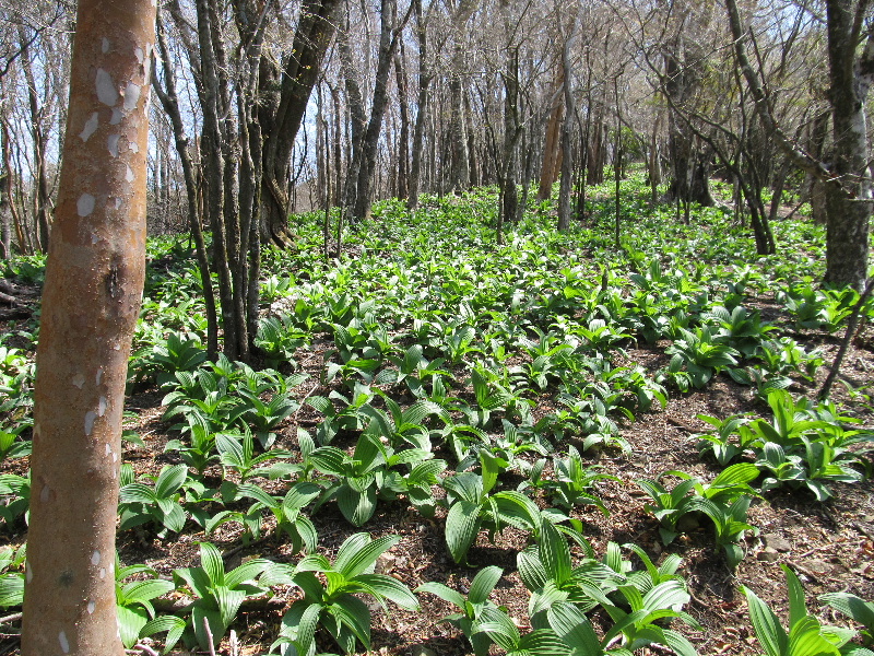 稜線に出ると気持ちよい森が迎えてくれた、バイケイソウが足元を埋める・・・・ちょっと多過ぎか
