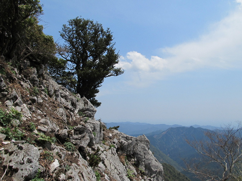 等高線の僅かなゆるみをトラバースで抜けて緩やかな尾根まで回り込むはずだったが、尾根横には山抜けが走っていて回り込めないではないか、仕方なく尾根を登っていく、簡単に登れるが上部が気になる所だ。この辺りの大内山川稜線は結構きつくて岩場の多いところ。案の定、岩の尾根になったかと思ったら正面に大きな岩が塞いでいる、痩せた尾根なので岩を回り込めないし・・・正面突破は・・・岩やさんなら登るかもしれないけど・・・むりむり、でもここで引き返せるか?ふと見ると左に鹿道が有るではないか、細いバンド低く張り出す枝にザックが当たる、下は見たくないほどの崖、少し木が有るのがありがたい。土の上を四つんばいになって這い上がるとクラの上に出た、ふ~怖かったよ