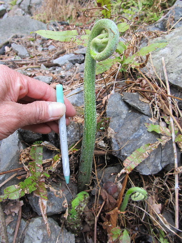 伊勢道を走ってると玉城町の灌漑溜め池の土手では朝も早くからワラビ採りをしているのが目にとまる、人に採られる前にとるのだろう。新緑の山の眺めを楽しみながらはしって紀勢大内山ICで降りた。熊野古道ツヅラト峠入り口に向かいトイレの有るパーキングの所から犬戻り峡に入るのだが、最近は来る人も余り居ないのだろう。