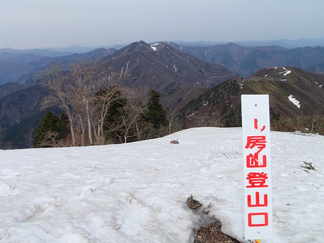 ここからは南に延びる尾根を一気に200mも下る。水平に見えていた権現への山並みが見上げるようになると、co1050ピークへの登り。ピークからは西へ方向が変わり、尾根南側の残雪を拾いながら進む。・1068からは左側がヒノキの植林に。最後は雪の急ピークだ。とても登れそうにないので右へ回り込むと、花房山頂で出会ったペアの足跡があった。雪が緩んでいるので、つま先キックで一歩一歩登ると山頂の祠が見えてきた。