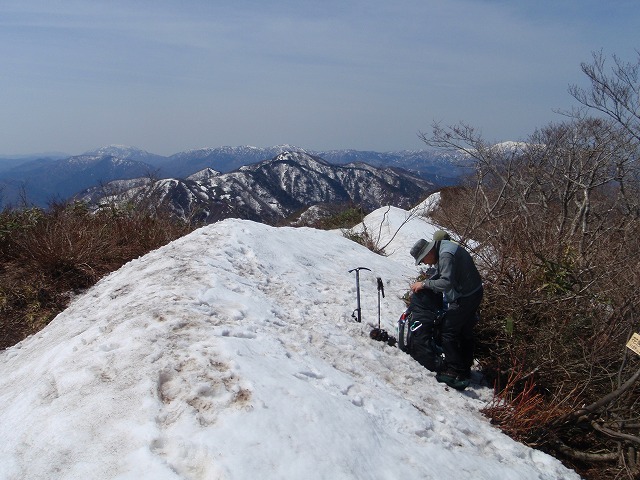 山頂からは能郷白山が目の前。往路からも見え隠れしていた真っ白の山容が一気に全容を現した。右奥には白山が今日は姿を見せる。左に目を移せば若丸~冠~金草…と稜線が続き、その奥には銀杏峰~部子山も白い。近く西側には五蛇池~蕎麦粒山に天狗山。北東目の前は雷倉。稜線をこのまま歩いて行けそうだ。それにしても山腹(と言うより山首部)を横に切り裂く傷(林道)は、なんとも無残だ。
