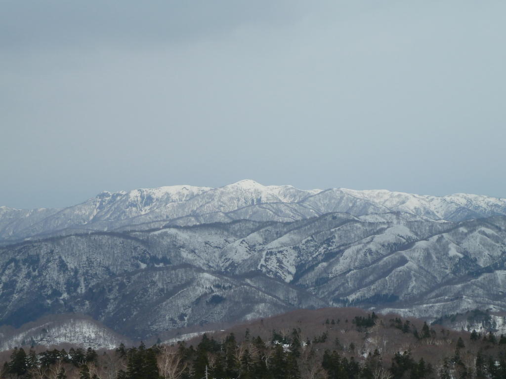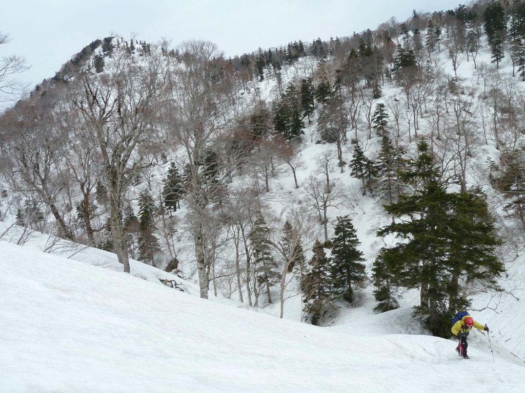 ポイントだったが、ヤブはすべて雪の下。ブナの疎林を一歩ずつアイゼンを利かせて登るだけだ。