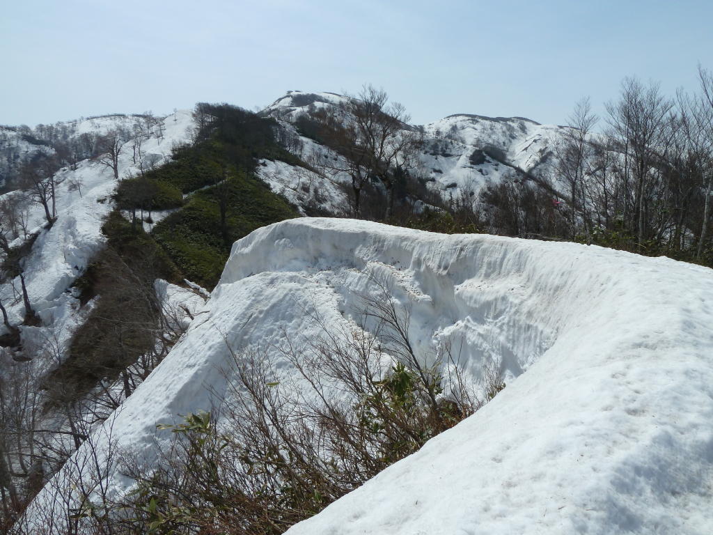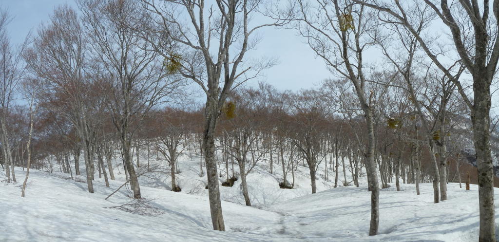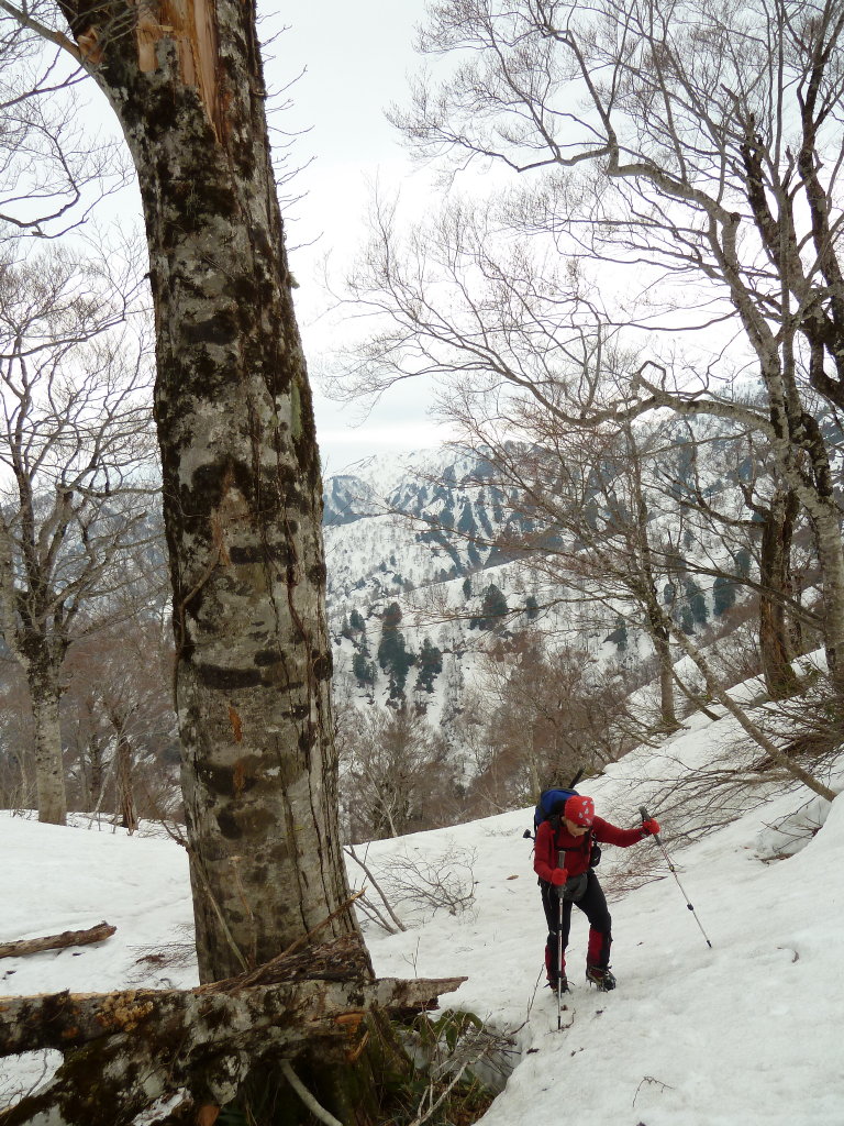 切り開きが終わってホンの少しヤブを漕げば、期待通り雪が繋がった。ブナ林が始まる1267m標高点からの急登のヤブが最大のポイントだったが、ヤブはすべて雪の下。ブナの疎林を一歩ずつアイゼンを利かせて登るだけだ。前回はヤブに気を取られてあまりわからなかったが、この急斜面のブナ林もなかなかのものである。