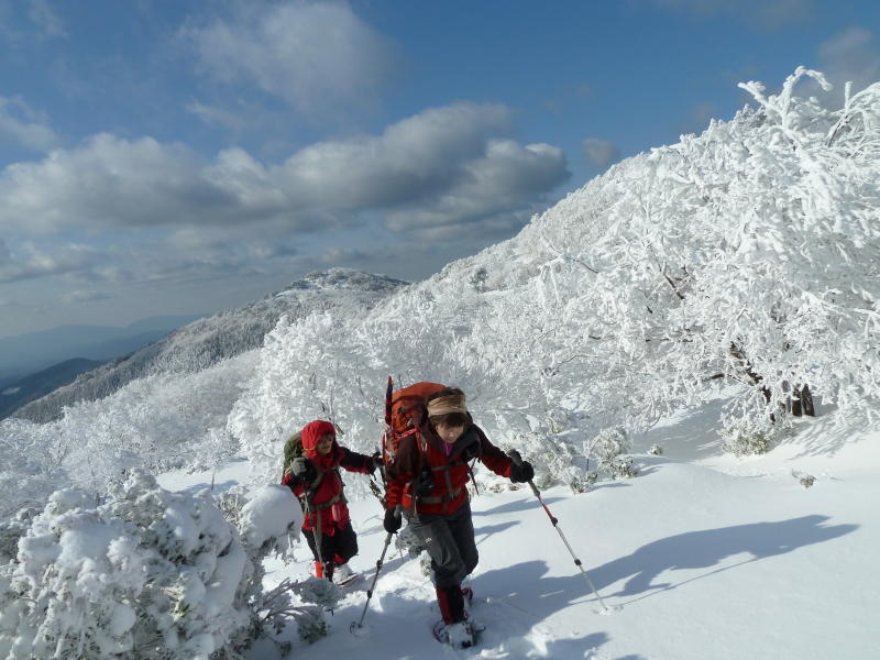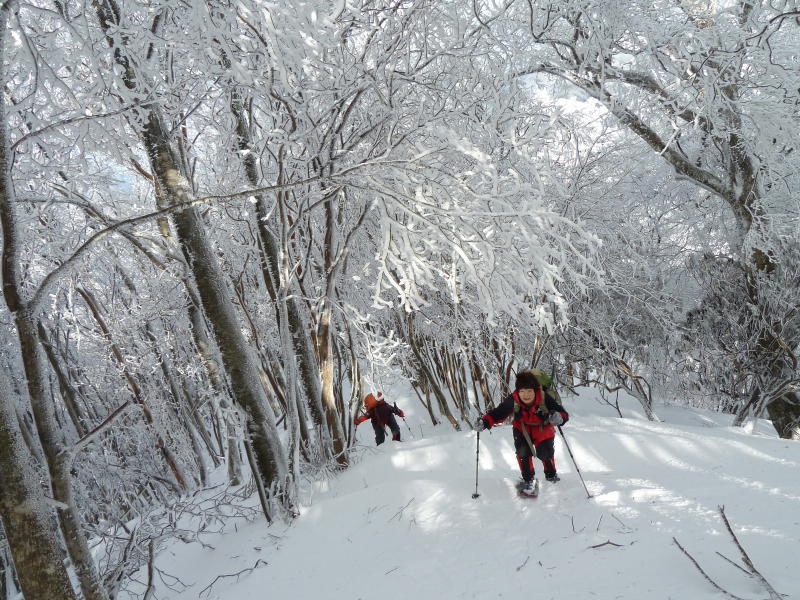 我々はP1316m手前からシロヤシオの尾根を辿ろう。雪はよく締まって歩きやすい。この尾根も霧氷のプロムナード。シロヤシオに付いた霧氷はまた違う趣がある。