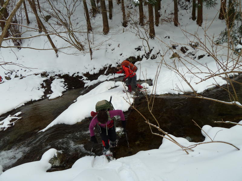 林道終点手前で本流を渡渉して、赤ゾレ山北東尾根の支尾根に取り付いた。のっけからなかなかの急登だ。トレースはいずれも林道を直進しており、ここからはヒザ下のラッセルが続いた。北東尾根までは少しの辛抱だ。バーチャリさんもひいちゃんも山らしい山は久し振りのようでアゴが上がり気味である。30センチほどの新雪の層の下にクラスト層があり、うまく足を置かないとずるずる滑ってしまうので疲れる。