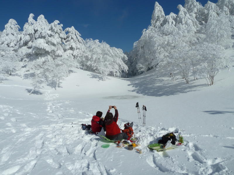 三者三様に鍋ランチを楽しむ。「今日も元気だビールがうまい」という昔のCMを思い出した。馬駈辻側の斜面に広がる霧氷の森は殊の外美しい。このシチュエーションで食するランチタイムはまさに至福の刻と言わずして何と言おう。