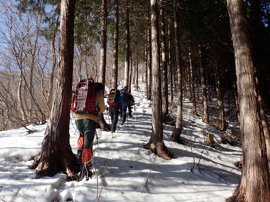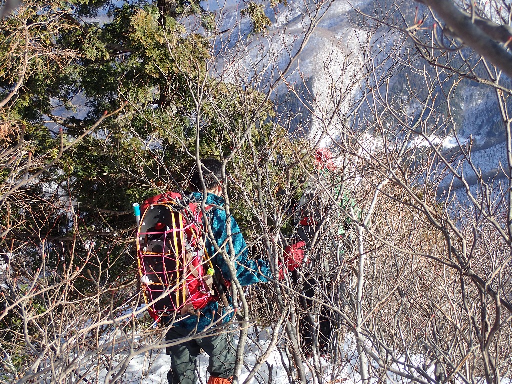 踏み跡に従って登っていく。早速ザックにくくりつけたスノーシューやピッケルが枝に引っかかる。早く雪の尾根に乗りたいーい!