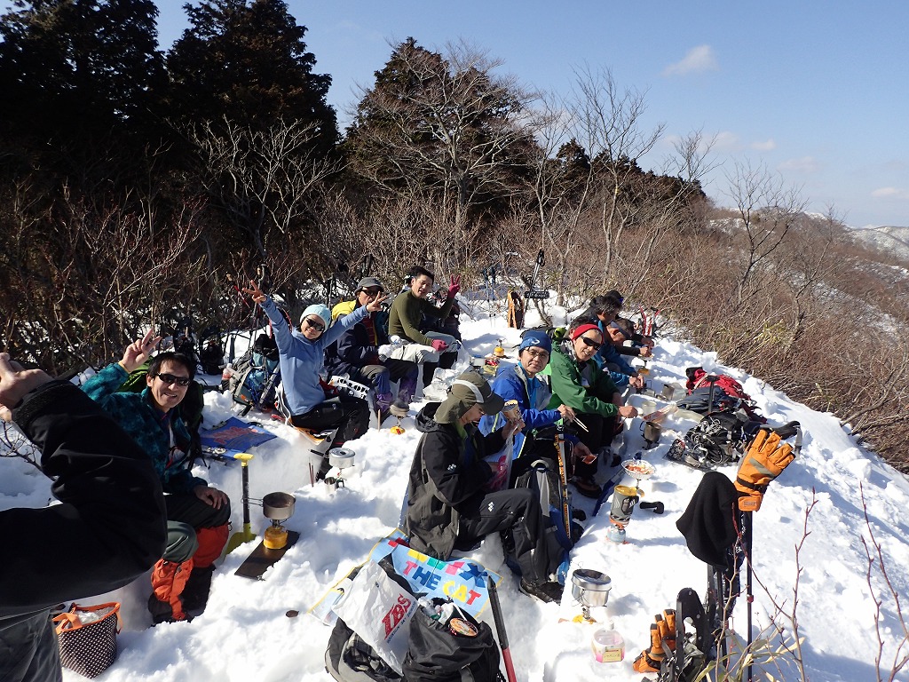 権現だ、蕎麦粒だなどと山座同定している。意識しないとこの作業はむずかしい。 そしていよいよランチだ。風もないので頂上の開けた場所が唯一のランチ場。ショベルでテーブルを作るほどの雪があるかと