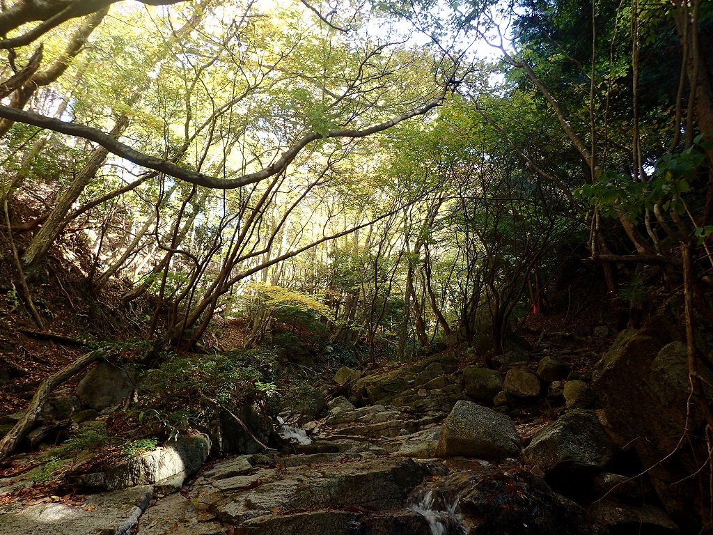 今までが植林だったのであまり期待していなかったがこれがなかなかいい。谷間を縫うように進む道は程よく整備されて歩きやすく広葉樹が広がったルートだった。