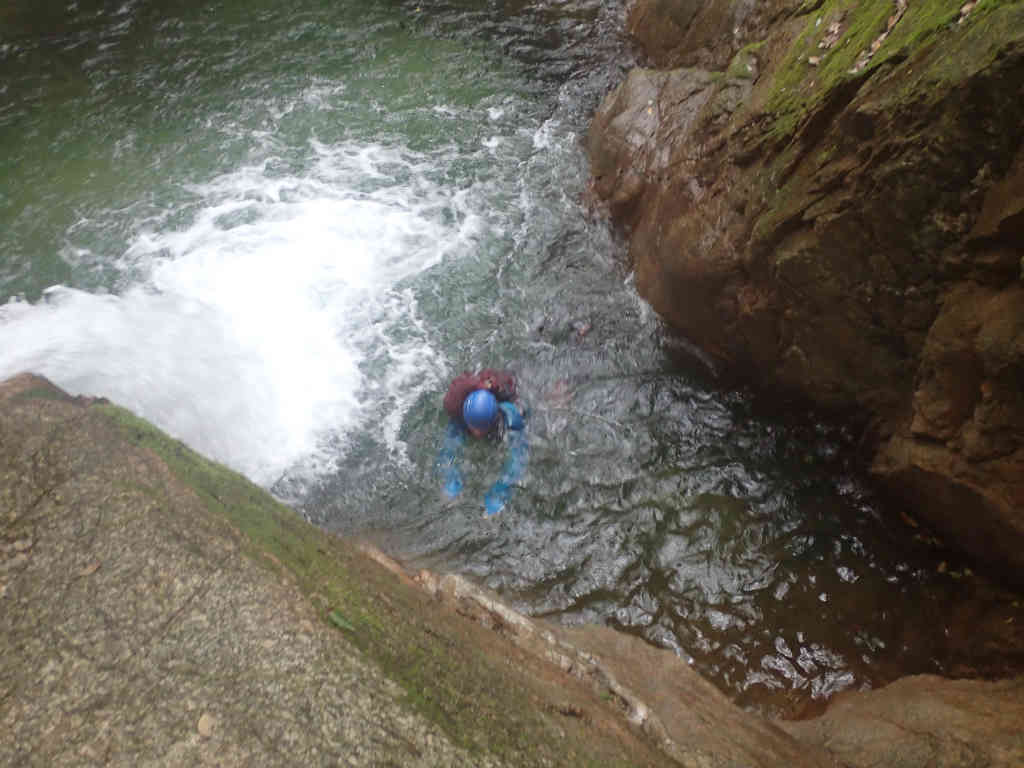 水に浮いていた滝で滝の直登はしないのだが、泳いで左壁に近づき左壁か奥のコーナーを登る)を登りきったところで足がつってしまった。残る5m滝は見事だが直登は出来ないので