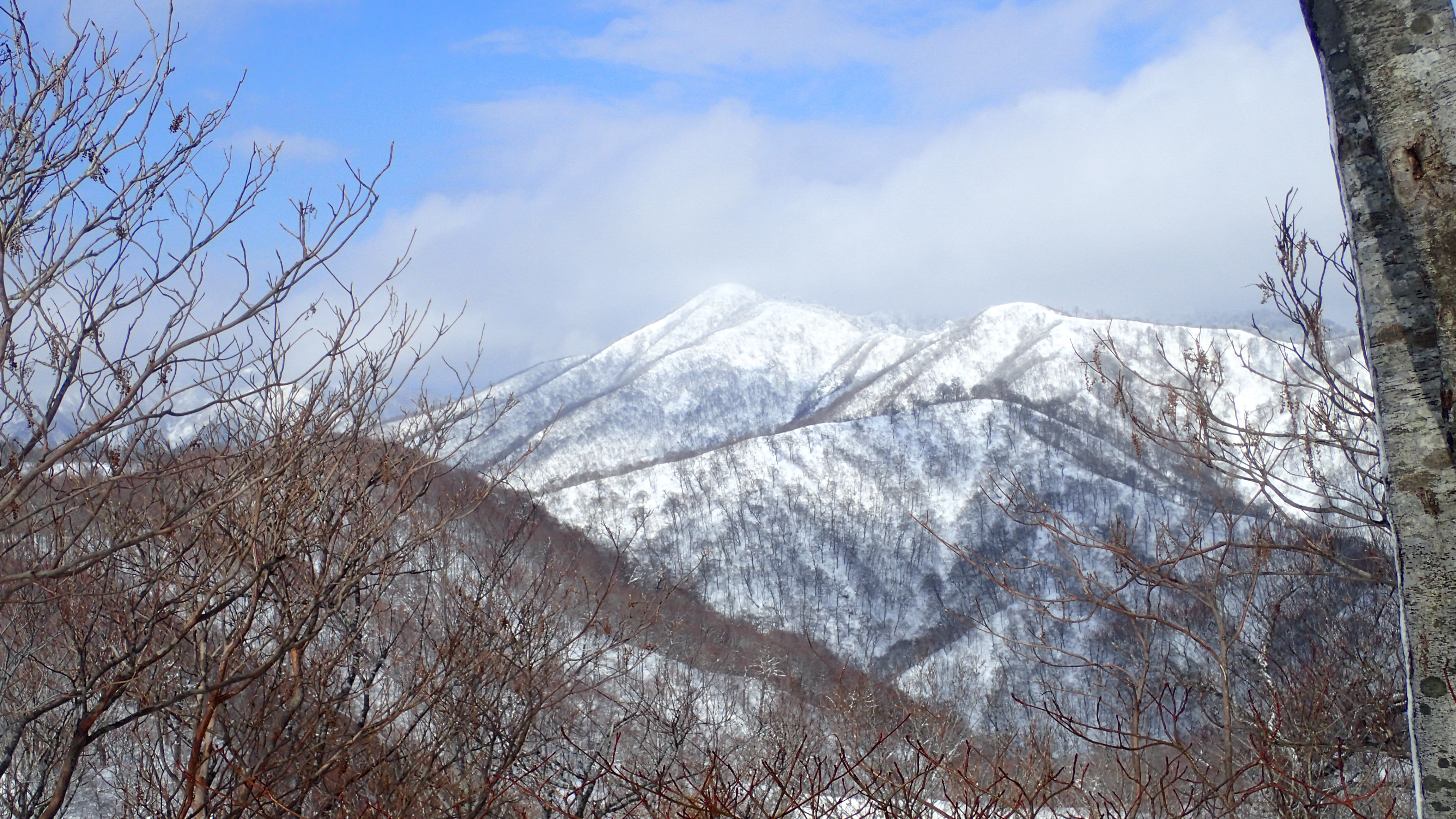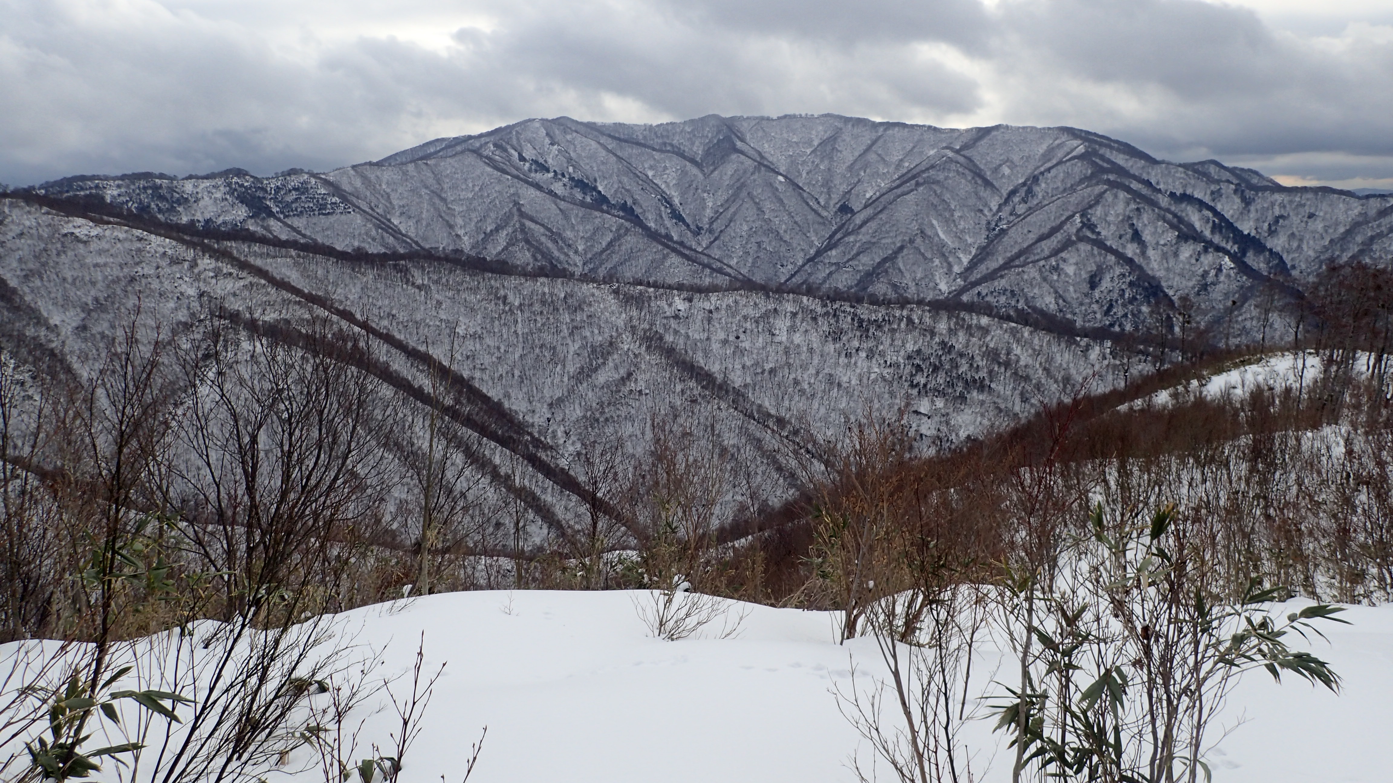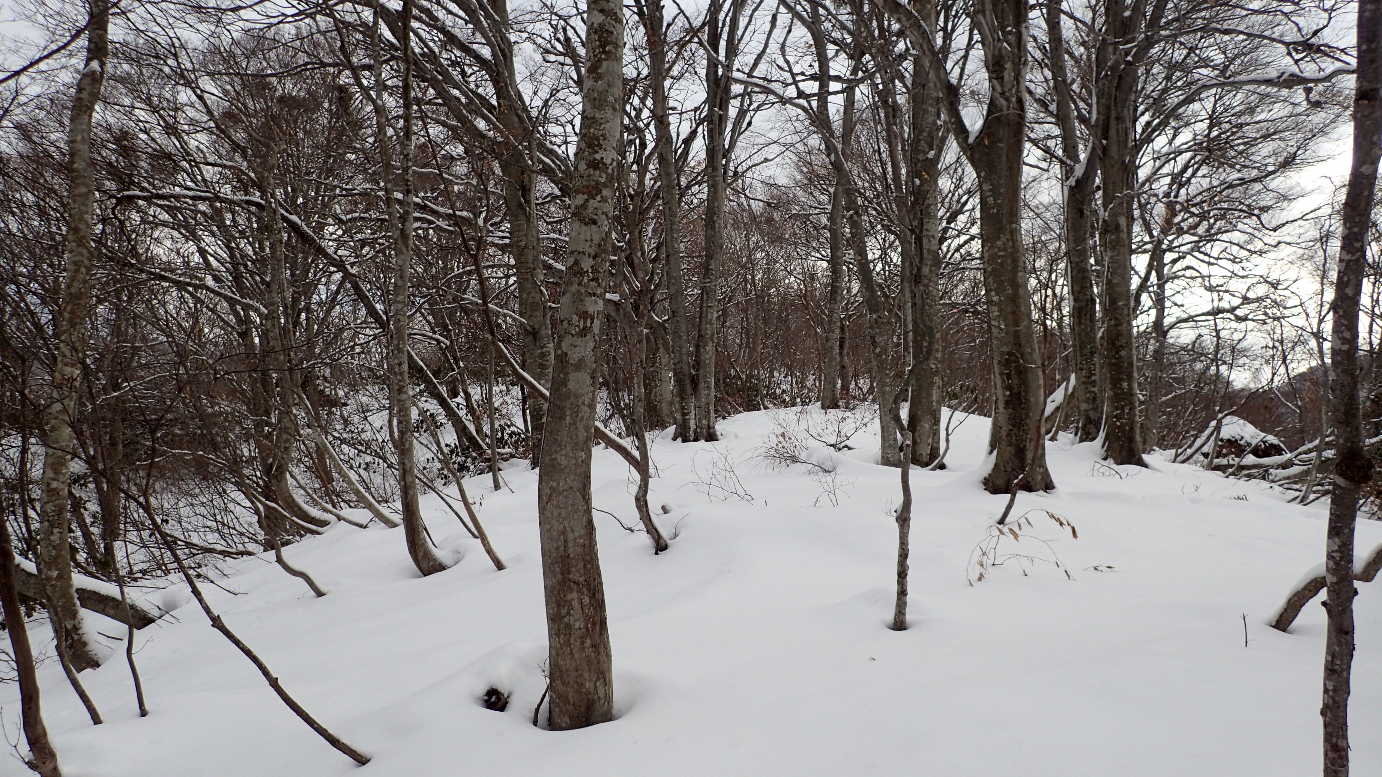 稜線には、けっこう多くのブナの大木が残っている。確かにもう少し積雪して、このちょっとイヤらしいヤブが沈んでくれると気持ちのよい尾根歩きとなるだろう。