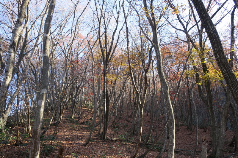 ヤブを突っ切って再びブナ林に入る。このあたりは尾根芯は杉の植林が入っており、尾根の西側斜面を拾って