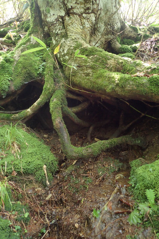 自然林のすっきりとした佇まいが素晴らしい。この潤いに乏しい稜線直下で水を得られるというのは想像もしなかったこ