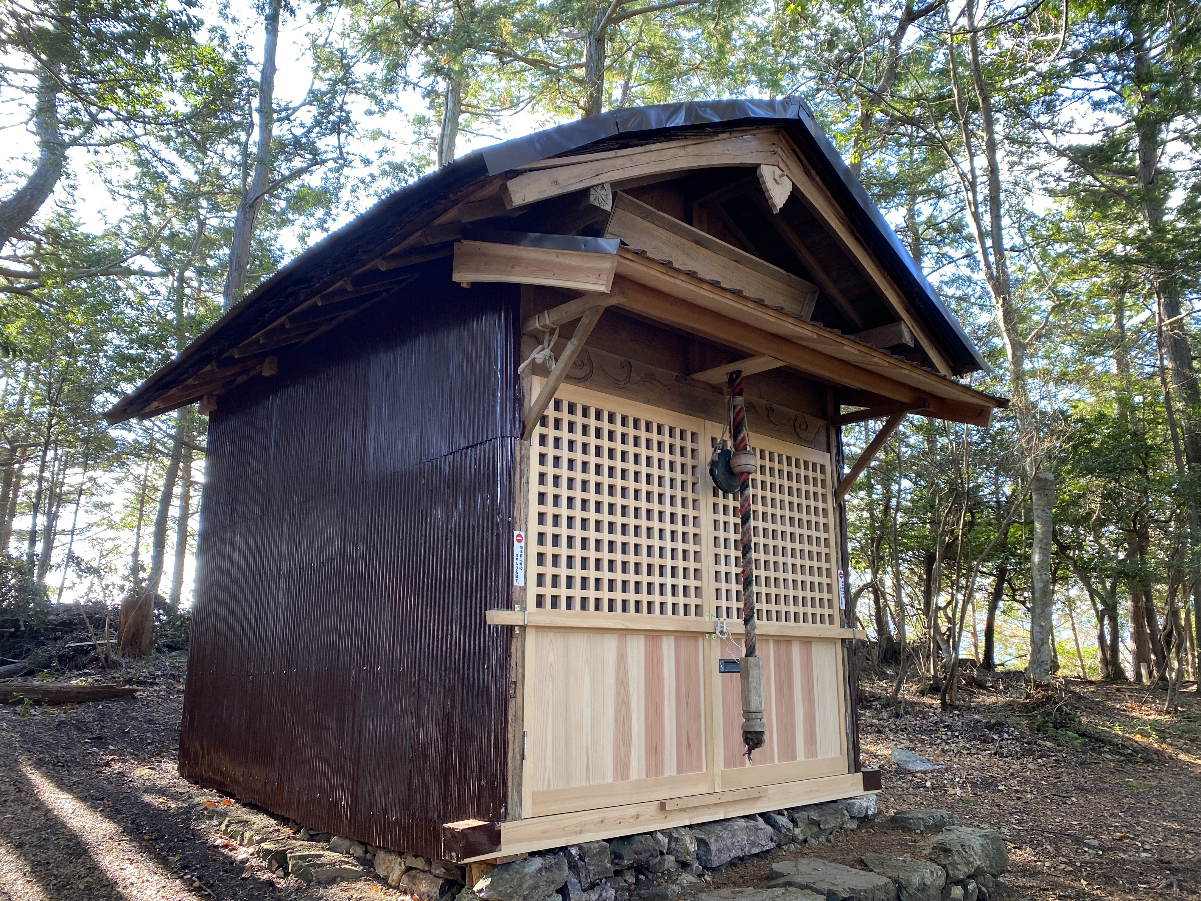 >山頂には、祠(行者小屋)があり、最近正面の扉が新しくなっていた。