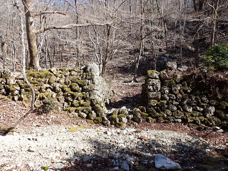 真砂谷源流の右俣に向けてトラバース気味に進むと、溝道が出てくる。これに沿って下っていくと六線索道跡に着く。強固な石垣に守られた平地にレンガやわずかな生活痕が残っている。
