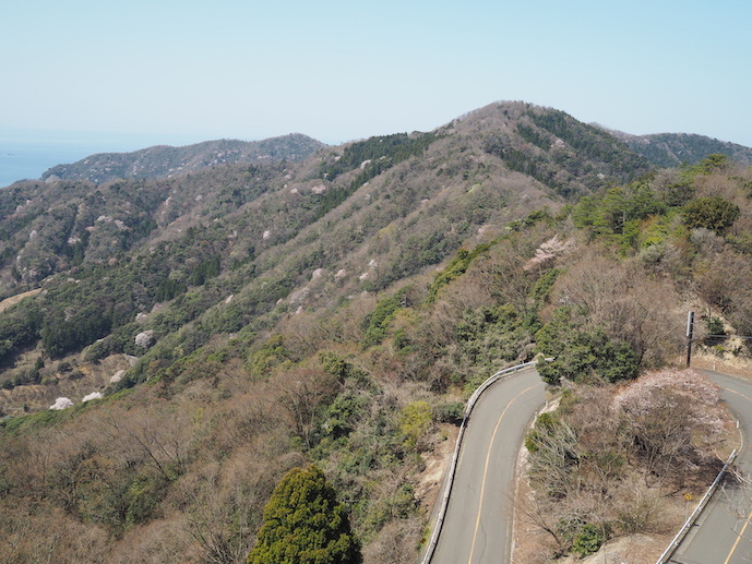 天気が良いせいかレインボーラインにはドライブを楽しむ人たちがかなり訪れているようだった。駐車場からは大きく展望が広がり、南側には三方五湖の彼方には雪が残る大御影山、三重獄とその手前に三十三間山が見える。周辺の山の斜面では多くの山桜が薄紅色の彩りを添えている。