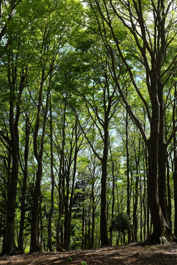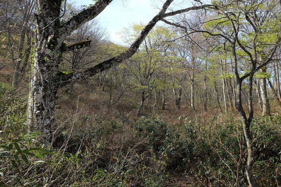 斜面が緩くなればあたりはこちらも淡い新緑の森が広がっていました。