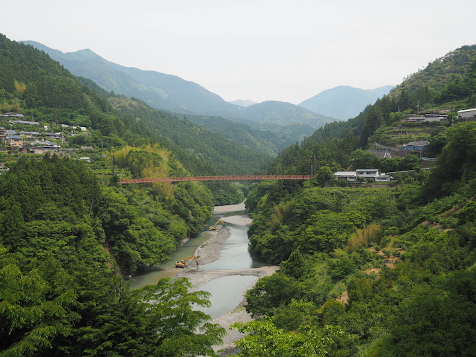 高知空港に降り立つと周辺の山々が白く霞んでいる。空気の湿度が高いのだろう。高知市内でレンタカーを借りると、まずは物部(ものべ)川に沿って、東に進む。緑色の水を湛える永瀬ダムにかかる橋を渡ったところで県道に入る。上韮生川に沿った道は谷からかなり高いところを進むようになり、秘境感が半端ない。