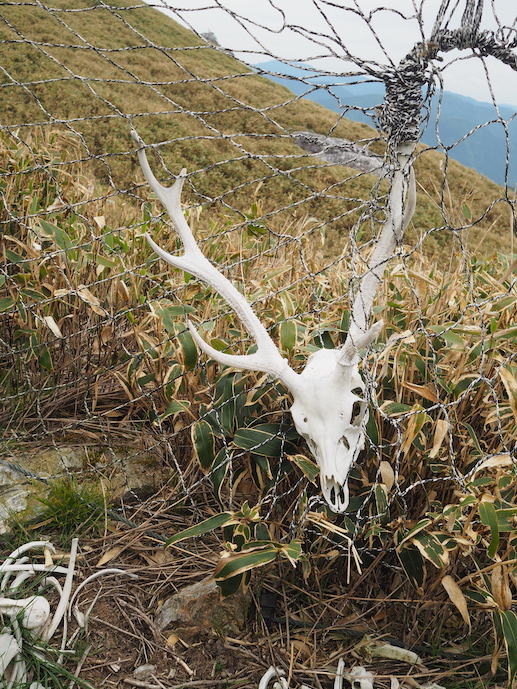 池からは左手のなだらかな斜面を登り、再び尾根に乗ると、ここでも防鹿ネットが中途半端に張られている。白髪山に向かって尾根を戻ると、鹿の一個体のほぼ完全な白骨がある。ネットには角が絡まった鹿の頭蓋骨があった。ここで苦しみながら死を迎えたのだろう。おそらくはこの山頂一帯に広がるミヤコザサの保護のためにネットを張っているのだろうが、このような鹿の遺体を見るのは痛ましい。そもそもこのネットは果たしてその目的を達しているのだろうかと疑問に思わざるを得ない。