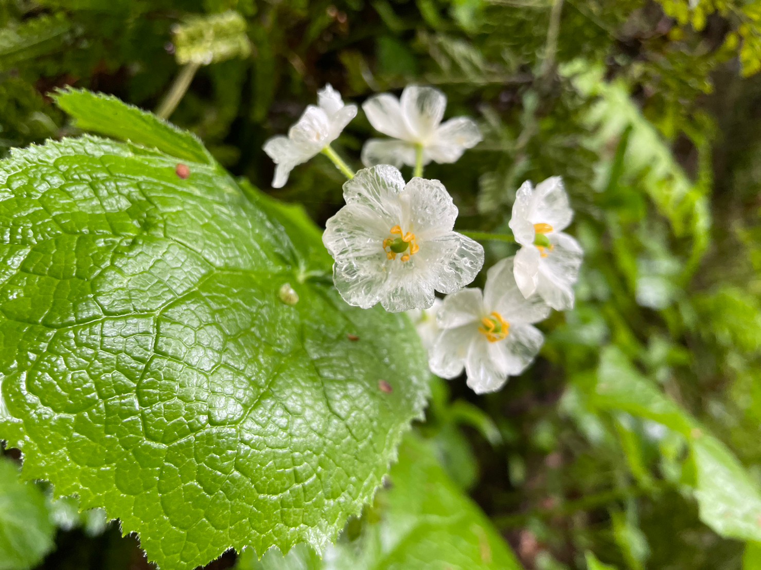 シラネアオイ、キランソウ、エンレイソウ、チゴユリ。スケルトンのサンカヨウは、繊細なガラス細工。自然の神秘。造化の妙だね。