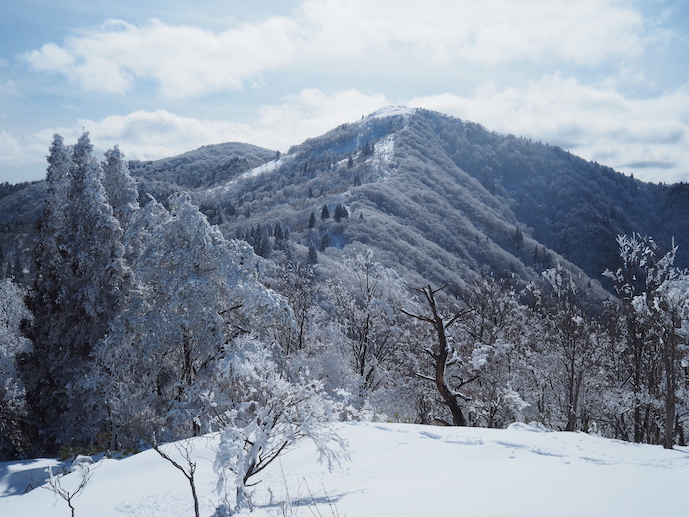 後を振り返ると、背後には純白に輝く白倉岳の稜線が視界に飛び込んでくると思わず瞠目する。どうやら昨夜のうちに山の上では降雪があったようだ。ということは釣瓶岳の山頂部では樹氷を纏う樹々の光景が期待出来そうだ。