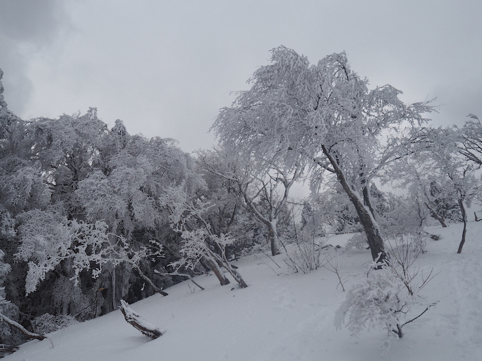 前日には綺麗に見えていた白山はおろか、琵琶湖の対岸の山々すら霞んでおり、対岸の景色は雲に混ざり合っているようだ。尾根は上部に達すると急に周囲の樹々には霧氷が現れる。