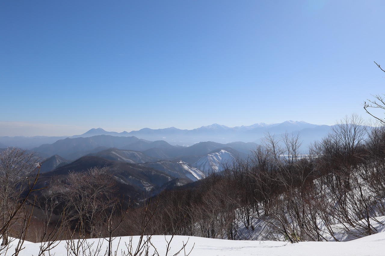 着いたピークからも南方向が開けている。中でも目を引くのが近くにある七ヶ岳。ゴジラの背中を想像させるコブのつながりが他の山と異なる姿を見せていて面白い。