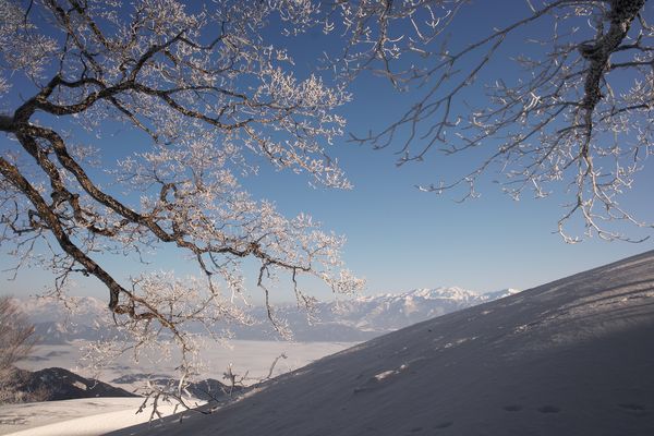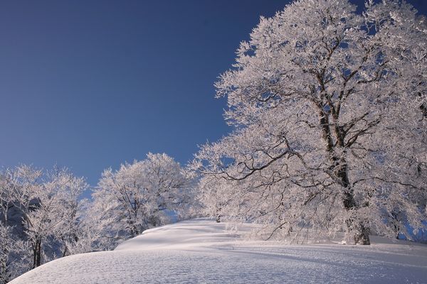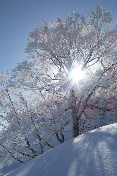 朝日を浴びた樹氷を中をあるきます。振り返れば大野盆地と白山。