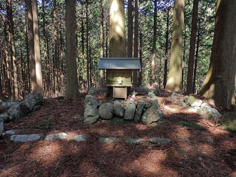 下りきると立川に出会い、手前の丘に一宮の鳥居と社がある。局ヶ岳には市岐嶋姫命が祀られていて麓の宮平(栗又)には一の宮があった。「あるとき一人の局(女官)が祈願のためか、一の宮から険しい山路を分け入り、奥の宮に参籠してふたたび姿を見せなかったという。だが、局の執念は山中にとどまった。その後、山小屋に入って働く木こり達は、しとしとと雨の降る夜、山上に美しい局の姿を見るようになったという。」という伝承があり。今いる場所が宮平で、山頂には奥の宮があり、この物語から局ヶ岳の名がつけられたようだ。山頂の祠跡は奥の宮だったようだ。