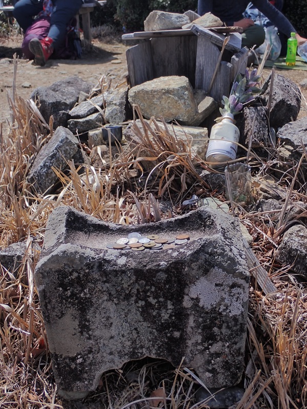 一の宮が健脚コースの分岐になっており、上り返す。健脚コースは沢筋の炭焼窯をつなぐ道を下部で使っており、沢登りの巻き道のような感じだが道は続いている。林道に出て再び山に入った所に湯飲み茶わんが12個きれいに並んでいる。朽ちた看板や説明書きがあるので読むと、「終戦直前の昭和20年3月に海軍軍用輸送機がここに墜落し昭和54年に全搭乗員の身元がわかり現地供養が行われた。」という新聞記事が貼ってあった。12名の搭乗員の中には、中曽根康弘首相の弟もおり、中曽根氏が遺族代表の挨拶を行ったと書いてあった。手を合わせ、尾根を進むとやせ尾根が出てきた。木の根頼りの急な尾根を登っていくがこれが長い。なかなか終わってくれないなあと嫌になってきたあたりで本コースに合流し、ひと上りで山頂にもどった。