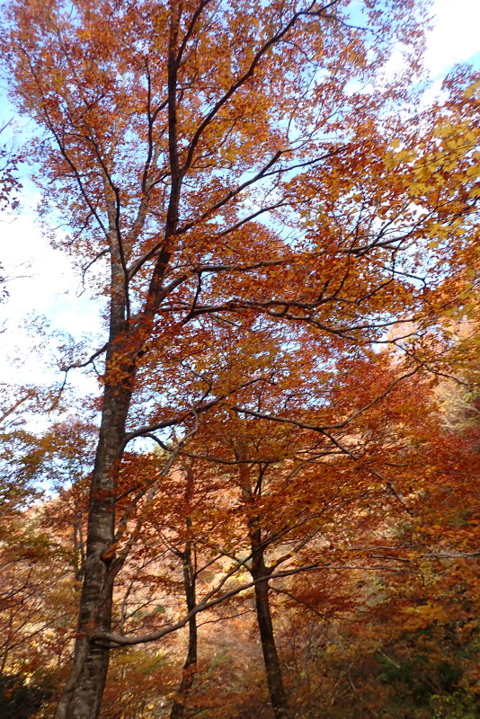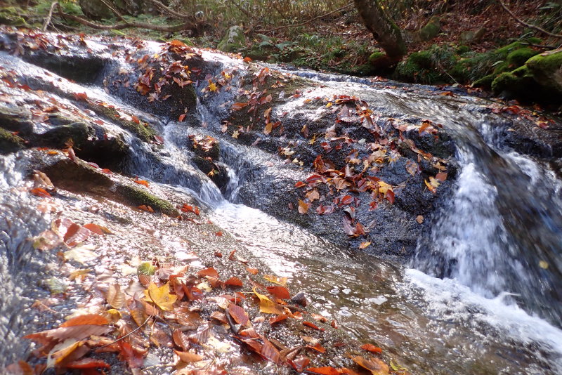 谷に降り立つと植林でしたが、すぐに見事な色彩に彩られた自然林に。穏やかな流れと今が真っ盛りの紅葉の森。ふっと現れるやさしく流れ落ちるちいさな滝。