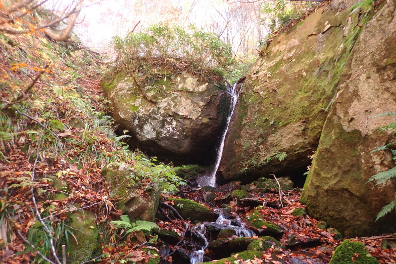 林道から一段と細くなった谷を進むと、巨岩を割るように落ちる溝状の5m滝が現れる。