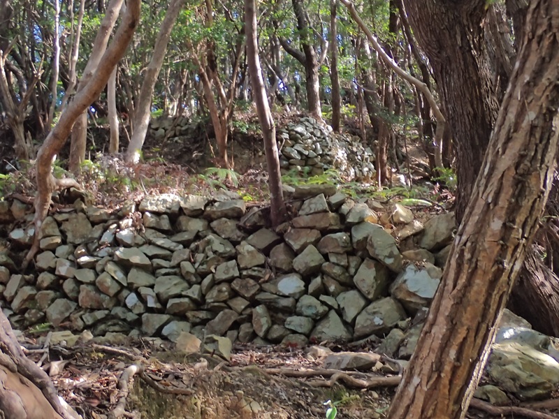 岬から周回道にトラバースしていく道があり、行きに使ったテープ道と違うものの上手につけられている。周回道から志戸ノ鼻に向かってトラバースしていく道もあり、急な斜面の道だが上下動の無い昔から使われてきた道だ。志戸ノ鼻の岬には小屋が立っていた石積みが残されており、魚見小屋だろうか。