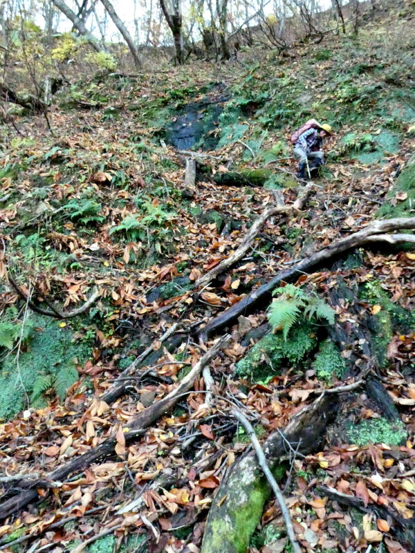 お昼の休憩を取った山頂手前の広場も気持ちのいい場所でしたね。まだ先は長いのにくつろいでしまいました。気が付けば14時。秋の日は釣瓶落とし。登山道の無い右岸尾根を下るのは厳しい時間に。