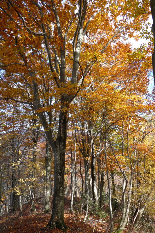 三角点弥谷の手前からブナが増え始め、山頂の先に見事な純林が残されていて驚く。ブナの黄葉も最高潮だ。