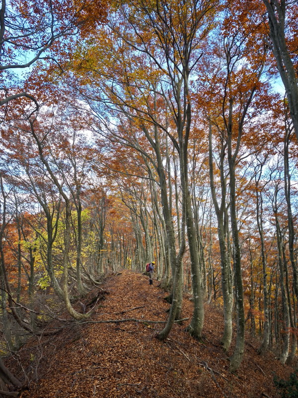 標高600mを超える尾根上のブナはまったく葉を落としておらず、体が黄色に染まりそうな尾根を味わいながら歩く。