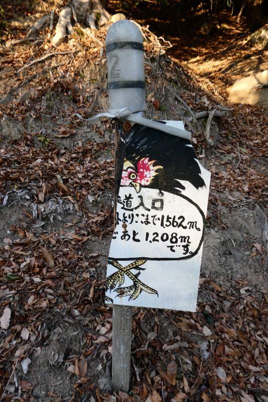 途中で分岐する道を左に取り、野登寺の入口から参道を下る。歩く人も少ないのか、落葉の下は石がゴロゴロして