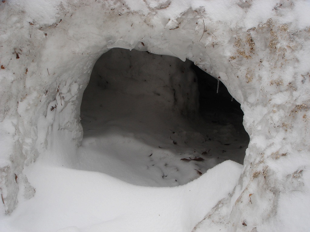 堰堤のうえをしばらく行くと雪洞があるではないか。横穴が三方に別れ3~4人は入れそうだ。まあこれもおそらく作り方からして三つ口の主Tさんの遊んだあとだろうな。雪を積み上げて水をかけて凍らす。そんな感じの作り方だった。去年ちらっとお会いしたがお元気だろうか。