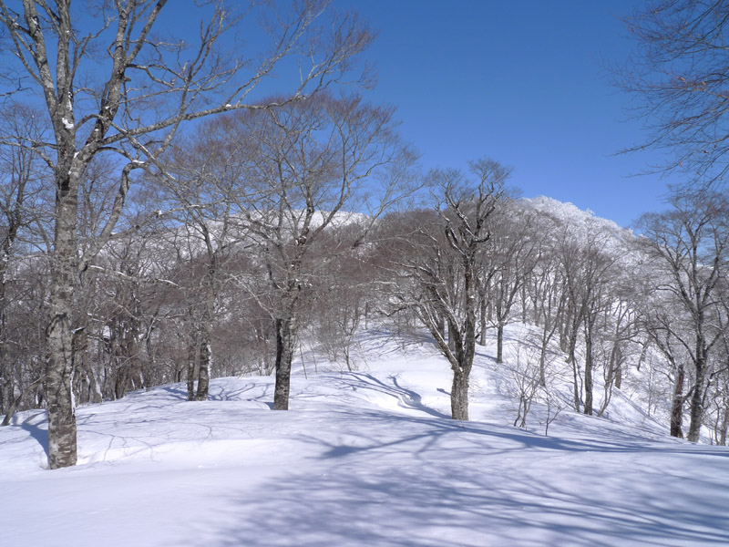 1400mあたりの広い窪地あたりから今回のルートの見せ場が始まった。ブナやミズナラが入り混じった明るい雪原が広がっている。斜面のとおり少し南に進む。南西に延びる尾根に乗ると南側が開けている。尾根には樹氷の森が続いている。そして北を望めば白く樹氷に覆われた広いピークが紺碧の空の下にどっしりと座っている。今日、この場所にいられたことをとても嬉しく思う。
