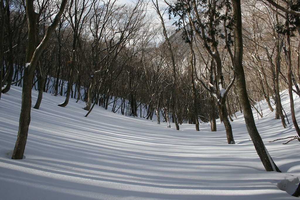 真の谷への下りは奥が谷というのですか。知りませんでした。降雪直後できれいですね。クロオ さんが書きました: 白船峠からは下り。アイゼンのまま、尾根道を下りる。真の谷も休憩せずに通過する。見上げると、木に霧氷は全く付いていない。東のボタンブチを目指しやや左方向に進む。急登だが、がまんして、一歩一歩、息を整えながら進む。日差しが暖かい。雪は適度に硬くて踏み抜くことは無いのだが、もうそろそろ、くさりそうだ。