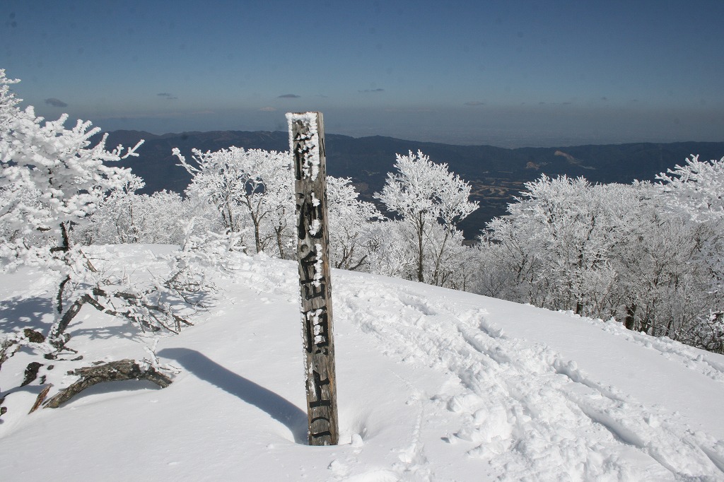 帰りは、県境から白船峠に戻ることにした。北上して、奥の平に着くと、すっかり晴れた。伊吹山はもちろん、能郷白山、御嶽山、乗鞍、北アルプス、中央アルプスも見える。南アルプスは見えない。丸山で、再び休憩。ここも、霧氷で真っ白。