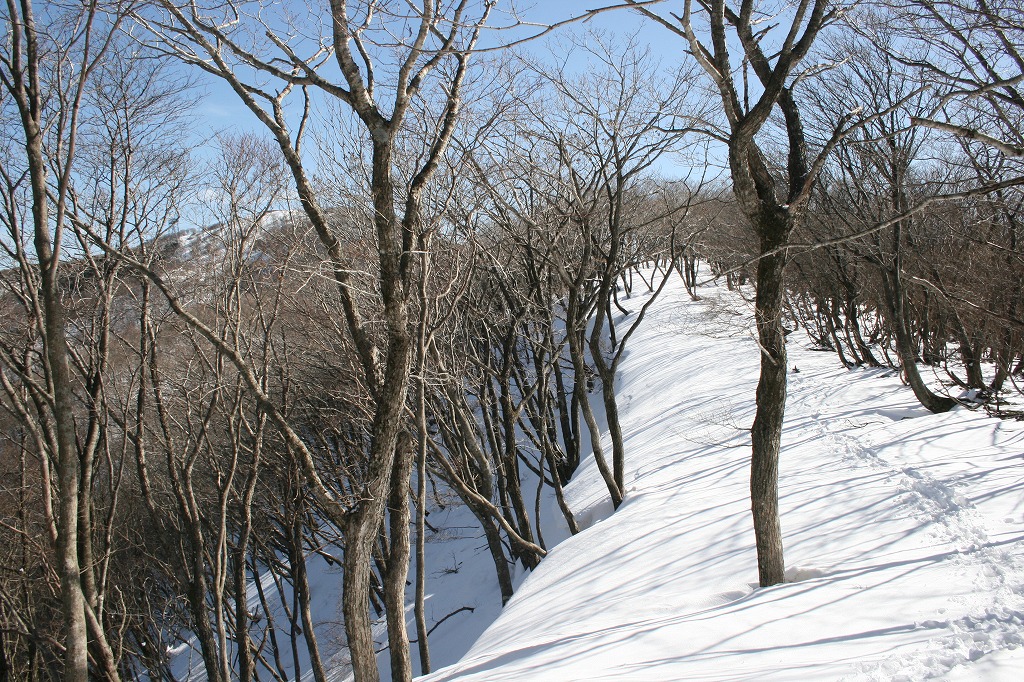 白船峠からは下り。アイゼンのまま、尾根道を下りる。真の谷も休憩せずに通過する。見上げると、木に霧氷は全く付いていない。東のボタンブチを目指しやや左方向に進む。急登だが、がまんして、一歩一歩、息を整えながら進む。日差しが暖かい。雪は適度に硬くて踏み抜くことは無いのだが、もうそろそろ、くさりそうだ。